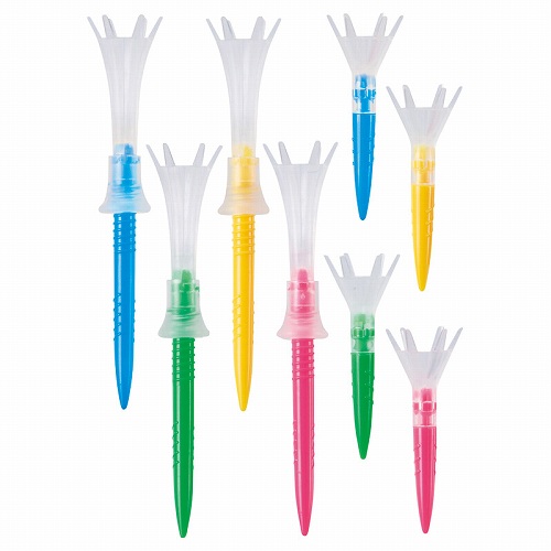 アジャスターを回して高さを約40〜50の範囲で調節可能、常に同じ高さでのドライバーショットが可能です。本体上部は柔らかい素材のためインパクト時の抵抗が少なく、振り抜きやすく、ティーも折れにくくなっています。EFD(Easy to Find Design)を採用し、ショット後にティーが飛んでも見つけやすいデザインとなっています。