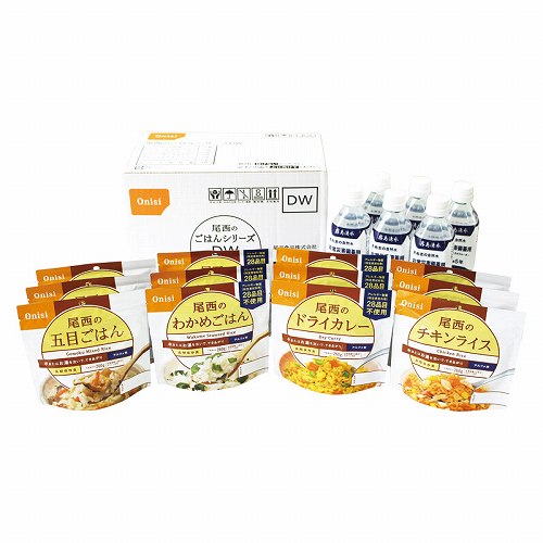 五目ごはん(100g)・わかめごはん(100g)・ドライカレー(100g)・チキンライス(100g)×各3・保存水(500ml)×6