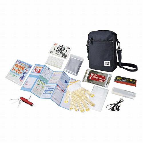 ショルダーバッグ(約170×240×70)×1、防寒シート・非常用トイレ・ポケットティッシュ(8W)・カイロ・マスク・防災用ウエットティッシュ(20枚)・コンパクトFMラジオ・万能ナイフ・すべり止め手袋・レインポンチョ・防災ガイド×各1