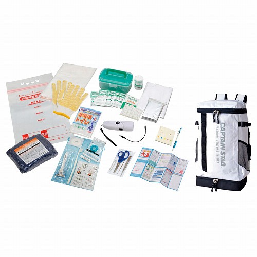 リュック(約500×280×150)×1、スマホ対応ダイナモFMラジオLEDライト・非常用給水バッグ(5)・シュラフ・防寒シート・非常用トイレ・すべり止め手袋・ポケットティッシュ(8W)・ふせんメモセット・ボールペン・救急箱・カット綿(3枚)・カットガーゼ(3枚)・救急絆創膏(2サイズ×3枚)・サージカルテープ・包帯・ハサミ・ピンセット・毛抜き・耳かき・清浄綿(2枚入×3枚)・宿泊セット用ポーチ・カミソリ・ハブラシセット・コンパクトブラシ・シャンプー&コンディショナー・石鹸・タオル・ヘアーバンド・ゴミ袋(4510枚入)・防災ガイド×各1