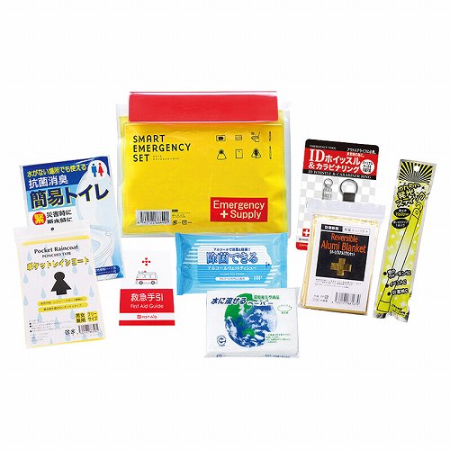 防水ケース(約195×233)×1、IDホイッスル&カラビナリング・発光スティック・レインコート・抗菌消臭簡易トイレ・救急手引・除菌アルコールウェットティッシュ・水に流せるペーパー(8W)・リバーシブルアルミブランケット×各1