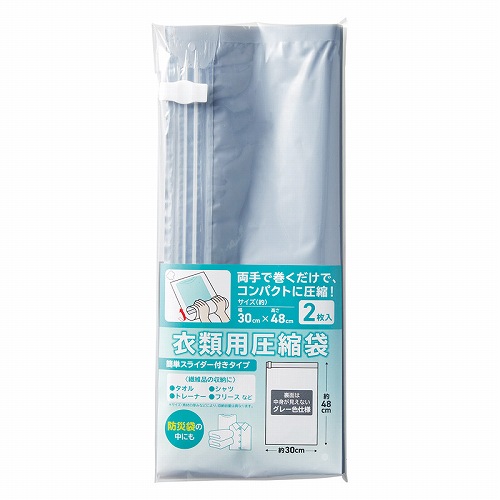 手押しでかさばる衣類を簡単に圧縮できます。スライダー付。旅行・出張時や非常時の為に防災バッグに入れても場所を取りません。破損しにくい厚手仕様。片面は中身が見えないグレー色。