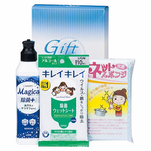 ライオンチャーミーマジカ除菌プラス(220ml)・ライオンキレイキレイお手ふきウエットシート(アルコールタイプ)(10枚入)・ネットスポンジ(1P)×各1