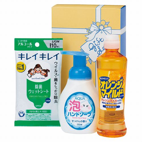 オレンジマイルドコンパクト(270ml)・アクア泡ハンドソープ(250ml)・ライオンキレイキレイお手ふきウエットシートアルコールタイプ(10枚入)×各1