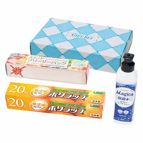 ポリラップ(22×20m)・ライオンチャーミーマジカ除菌プラス(220ml)・スタンドフリーザーバッグ(5枚入)×各1