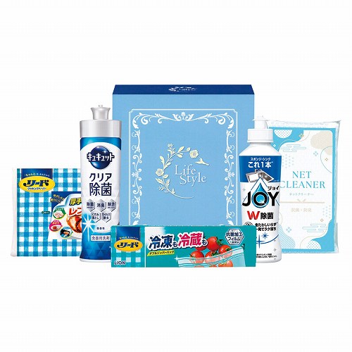 花王キュキュットクリア除菌(220ml)・P&G除菌ジョイコンパクト(170ml)・リード冷凍も冷蔵も新鮮保存バッグ(S3枚)・リードクッキングペーパー(小4枚PP袋入)・ネットクリーナー(1P)×各1