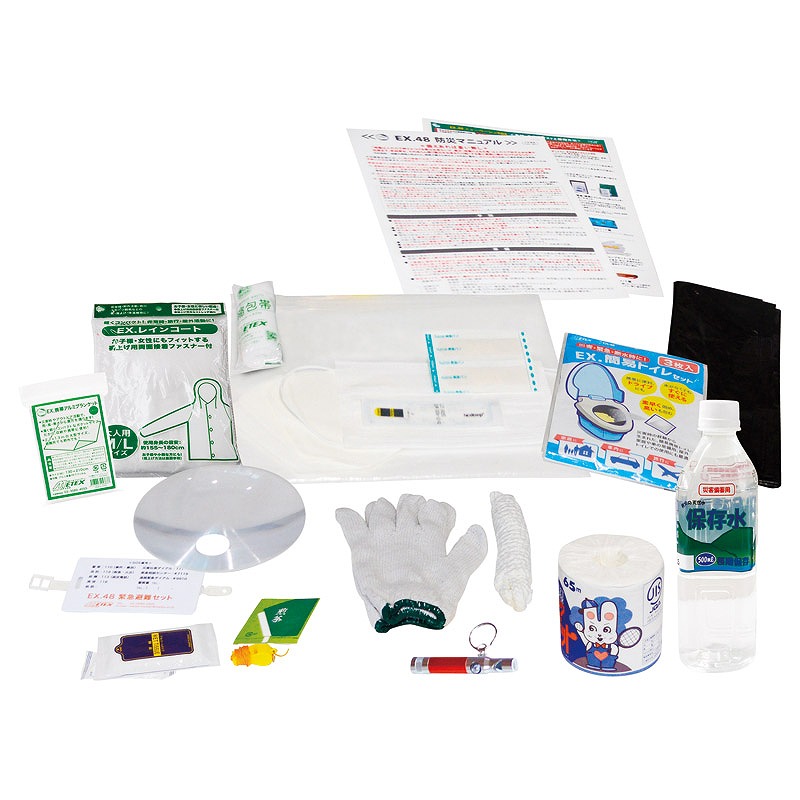 絆創膏・ろ過フィルター×各2、防災バッグ(35×25×48~87cm)・甘味物(氷砂糖)・保存飲料水(500ml)・マスク・トイレットペーパー・簡易トイレセット(3枚入)・医療用シート体温計・携帯アルミブランケット・収納ポーチ・軍手・笛・ロープセット・雨衣・ポリ袋・うちわ兼用拡大鏡・ネームカード・災害時連絡リスト・防災マニュアル・笛付きLEDライト・包帯・アルコールティッシュ・お茶×各1