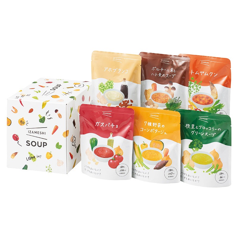 ガスパチョ・7種野菜のコーンポタージュ・枝豆とブロッコリーのグリーンスープ・アホブランコ・ポルチーニ茸とハト麦のスープ・トムヤムクン(各180g)×各1