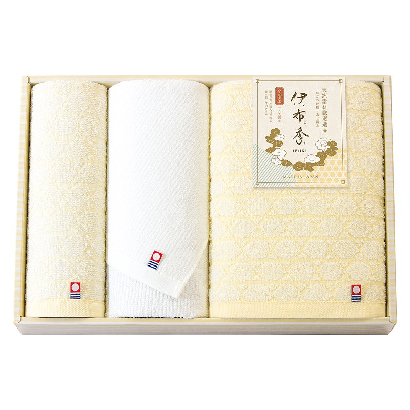 伊予の穏やかな地で百三十年の伝統が織りなす季節を紡ぐ、「かごめ紋様」と「あぜ織布」の日本の伝統的な模様をあしらったやさしい色合いの今治タオルです。