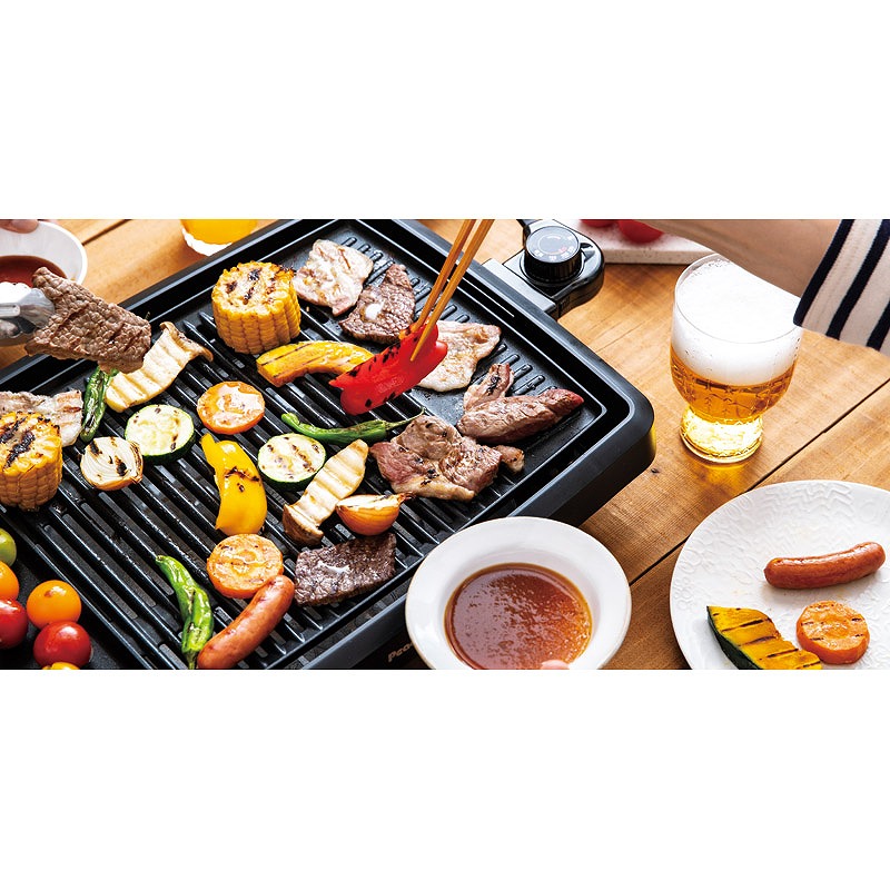 保温から約230℃まで温度調節が出来ます。プレートは取り外しができて、丸洗いが可能。調理中の煙を約87%削減、調理中の油ハネを約98%削減。