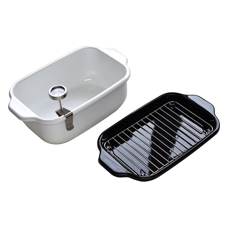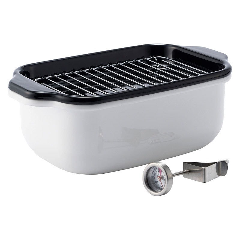 小さめでコンパクトなのに長い食材も調理でき効率的。バットとスノコ、防水温度計付き。ほうろう用鋼板にガラス質を焼き付けたホーローは酸や塩分に強く、匂いや汚れもつきにくく洗えばスッキリ落とせ、いつまでも光沢を保ちます。本体、バットはオーブン調理もOK。200VIH対応可能。