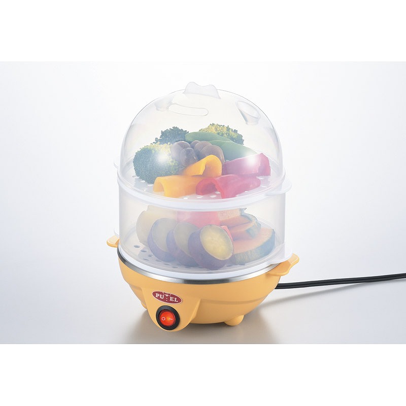 ゆで卵と蒸し料理が調理できる電気蒸し器!ゆでたまごが一度に7個作れます。半熟玉子、完熟玉子もお手のもの!「半熟・やわらかめ・かため」水の量を調節することでゆで加減が選べます。二段同時の調理で時短メニュー!蒸し料理やお料理の下ごしらえなどが一度にできるので1品プラスに一役買います。