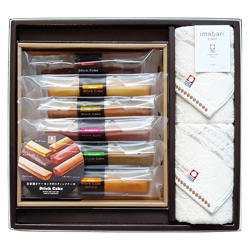 フェイスタオル(34×80cm)×2、スティックケーキ(プレーン・チョコ・ラズベリー・ブルーベリー・チーズ・ピスタチオ・レモンティ)×各1
