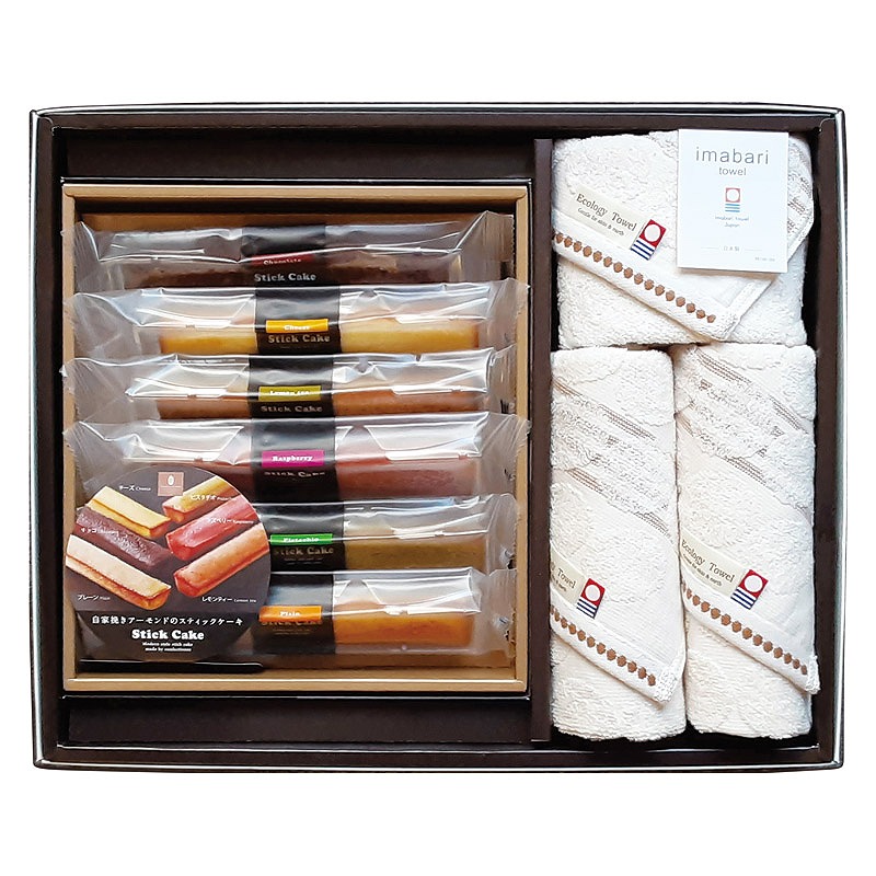 フェイスタオル(34×80cm)×2、ウォッシュタオル(34×35cm)・スティックケーキ(プレーン・チョコ・ラズベリー・ブルーベリー・チーズ・ピスタチオ・レモンティ)×各1