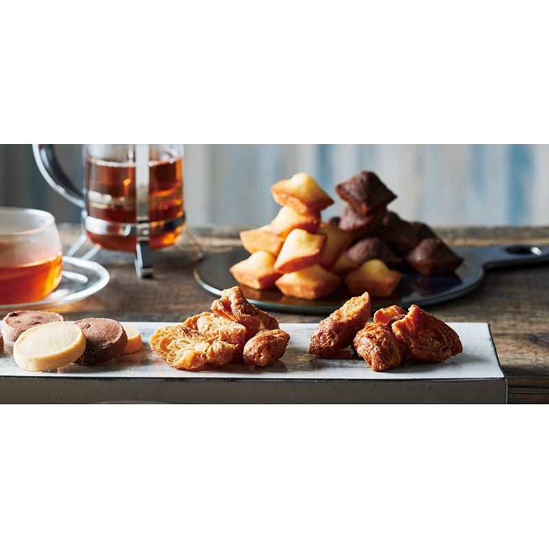 クッキー(プレーンバニラ・チョコチップ)×各3、クロワッサンラスク(シュガーバター風味・キャラメル)・プチフィナンシェ(プレーン・ショコラ)(各6個入)×各1