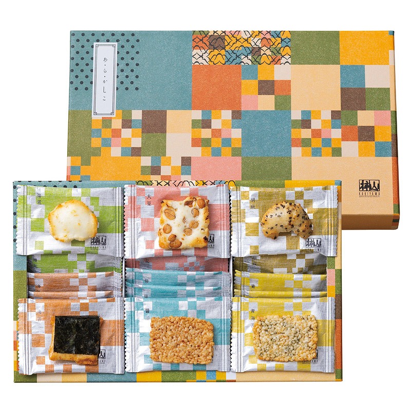 伝統工芸・寄木細工をアレンジしたモダンでカラフルなパッケージは、カジュアルながらも高級感があり、様々な手土産に最適です。中には一口サイズのおかきを6種類詰合せました。
