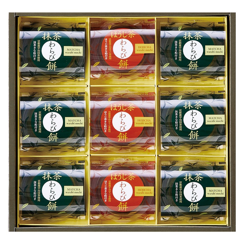 抹茶わらび餅(89g)・抹茶きな粉(3.5g)×各6、ほうじ茶わらび餅(89g)・ほうじ茶きな粉(3.5g)×各3