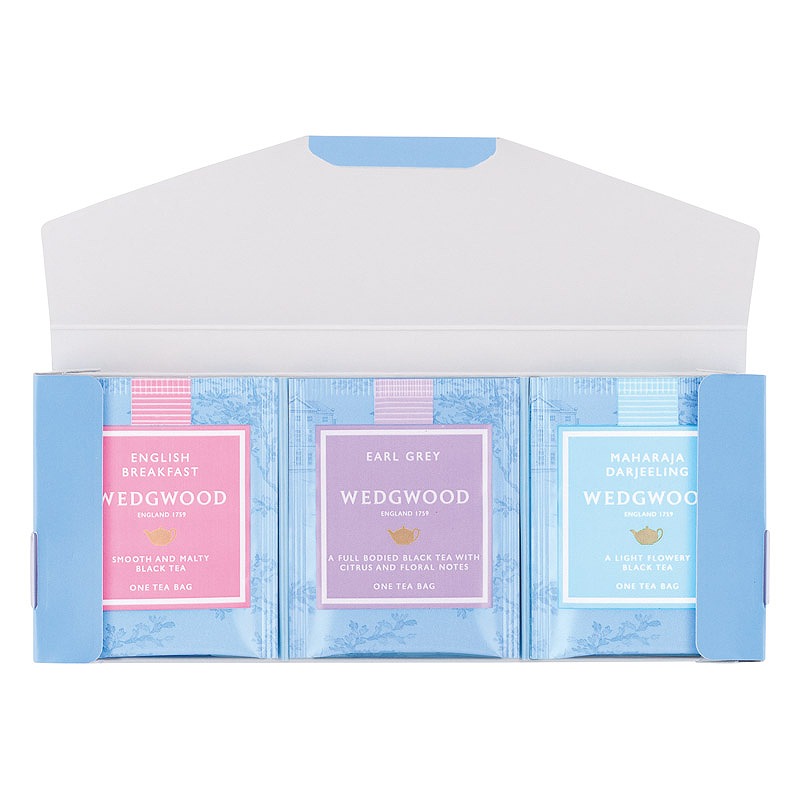 紅茶の国「英国」発祥のウェッジウッド。可愛らしい水色のパッケージに包まれたアソートティーバッグ。紙箱に入った3種類の紅茶はちょっとしたお返しや挨拶の品としてお勧めです。紅茶のシャンパンと呼ばれるダージリン、ベルガモットの爽やかな香りのアールグレイ、ベーシックな英国紅茶のイングリッシュブレックファストの3種入り