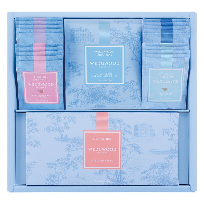 イングリッシュ ブレックファスト・アールグレイ・ウェッジウッドオリジナル・マハラジャダージリン(各2g)×各5、オリジナルドリップコーヒー(10g)×3、ティークッキーアソート(アップル・レモン)(各80g)×各1