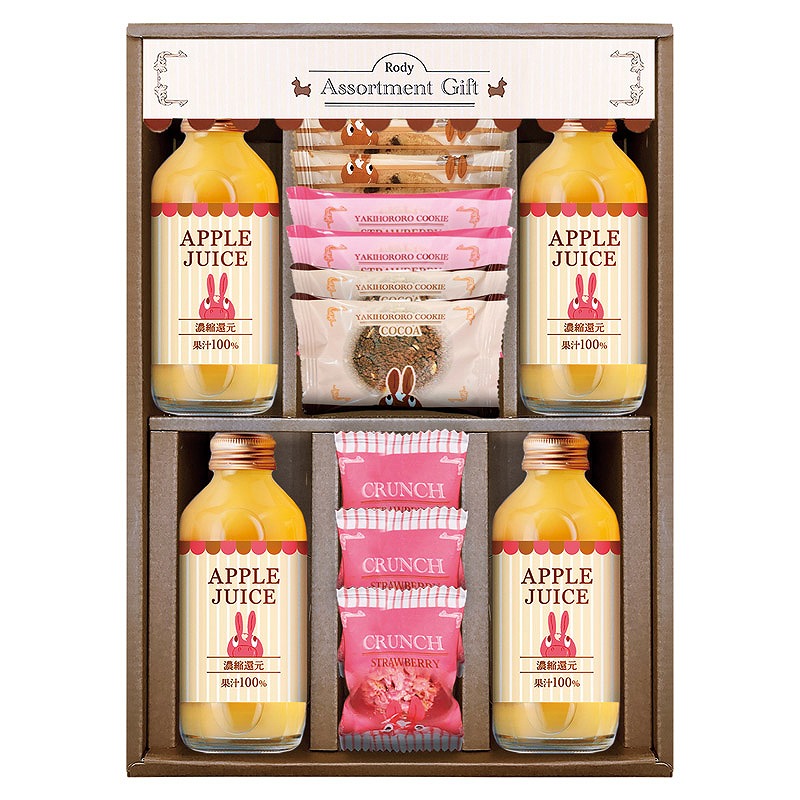アップルジュース(180ml)×4、チョコクランチ(ストロベリー)×3、焼きほろろクッキー(ココア・ストロベリー)・ナッツとチョコのざっくりクッキー×各2