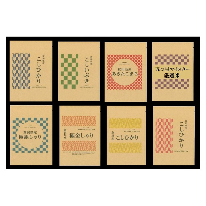 新潟県産コシヒカリ(300g)×4、新潟県産こしいぶき・秋田県産あきたこまち・五ツ星マイスター厳選米・魚沼産コシヒカリ(各300g)×各1