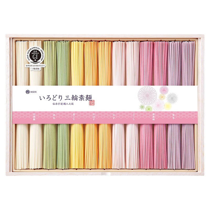 彩り三輪そうめんは特に女性へ向けた商品として作られております。キレイな花を買ってリビングに飾ることで気分がリラックスするように、様々な色合いを贈り物で使ってもらい味や香りを楽しんでもらいたい素麺です。