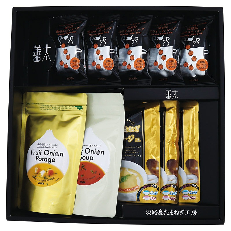 ・朝のオニオンスープは、フリーズドライ製法のバターとオニオンの香る本格ビストロの味です。・金の玉ねぎポタージュは、冷やしても温めても美味しい、フルーツ玉ねぎの甘さに生クリームのコクを プラスしたレトルトのポタージュです。・ZENTAの金のポタージュ、はフルーツ玉ねぎを1食に3分の1個も使用した、甘くて濃厚、 クリーミーな贅沢スープです。ホットミルクで作るとよりクリーミーに仕上がります。・淡路島フルーツ玉ねぎスープは、お湯を注ぐだけでも美味しいスープですが、コンソメ代わりに 刻んだ野菜を煮込んだり、調味料としてチャーハン、カレー、唐揚げ、煮物の隠し味にも重宝します。