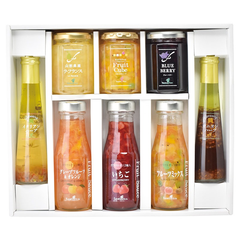 ジャム(山形県産ラフランス・ブルーベリー)(各145g)・ミックスジャム(フルーツキューブ)(155g)・フルーツソース(グレープフルーツ&オレンジ・いちご)(各220g)・フルーツソース(フルーツミックス)(215g)・ドレッシング(イタリアンハーブ・オニオンハーブ)(各122ml)×各1