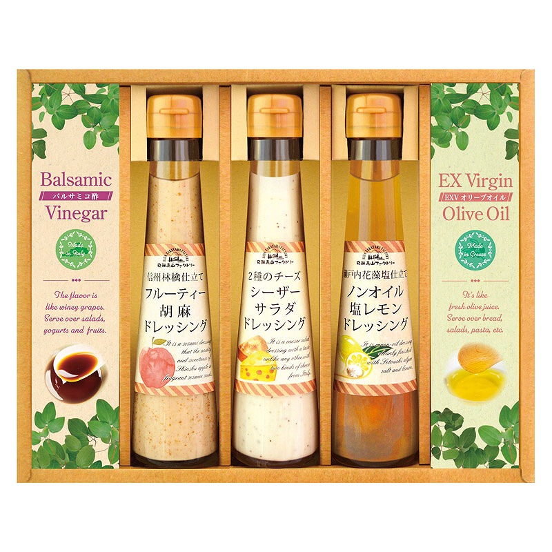 ドレッシング(信州林檎仕立てフルーティー胡麻・2種のイタリアンチーズシーザーサラダ)・瀬戸内花藻塩仕立てノンオイル塩レモンドレッシング(各120ml)・エクストラバージンオリーブオイル(8g×5p)・バルサミコ酢(3.3ml×5p)×各1