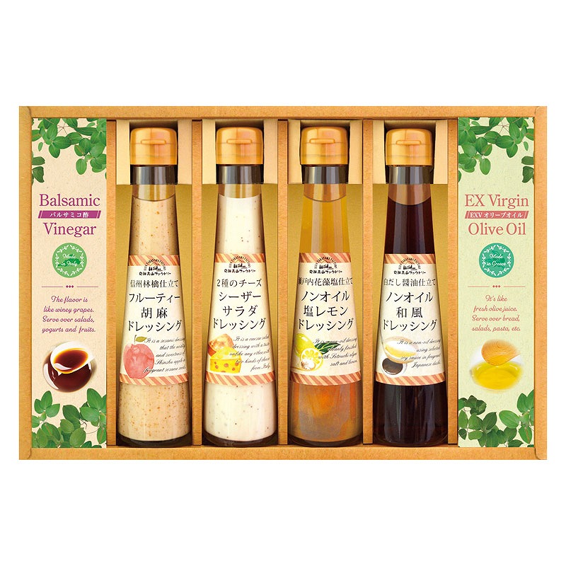 ドレッシング(信州林檎仕立てフルーティー胡麻・2種のイタリアンチーズシーザーサラダ)・瀬戸内花藻塩仕立てノンオイル塩レモンドレッシング・白だし醤油仕立てノンオイル和風ドレッシング(各120ml)・エクストラバージンオリーブオイル(8g×5p)・バルサミコ酢(3.3ml×5p)×各1