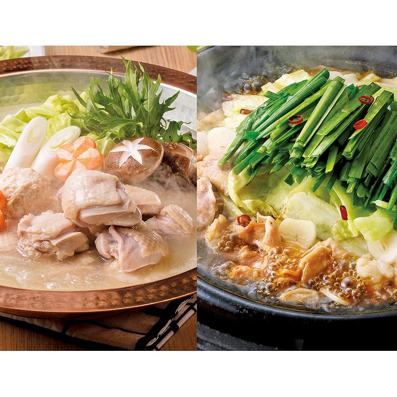 水たき:水たき生スープ(600g)×2、華味鳥切り身(300g)・華つくね(200g)・ちゃんぽん麺(150g)・博多ぽん酢(220ml)・柚胡椒(30g)×各1、もつ鍋:もつ鍋スープ(600g)×2、牛小腸(200g)・鶏はらみ(100g)・華つくね(200g)・ちゃんぽん麺(150g)・にんにくスライス(5g)・唐辛子(1g)×各1