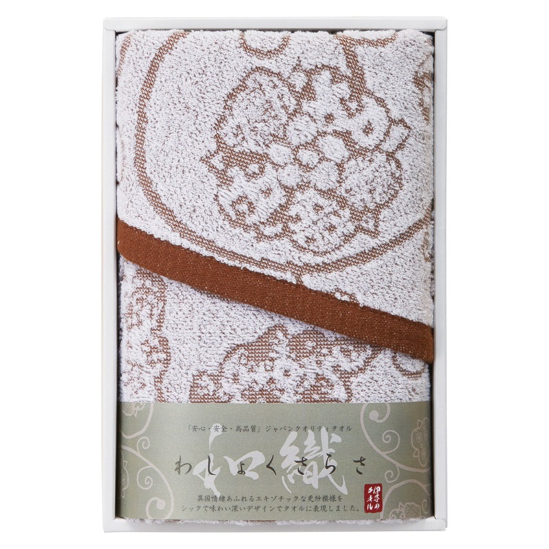異国情緒あゆれるエキゾチックな更紗模様をシックで味わい深いデザインでタオルに表現しました。この商品はプラスチックごみを減らすためOPPフィルムの代わりに紙の保護紙を使用しています。