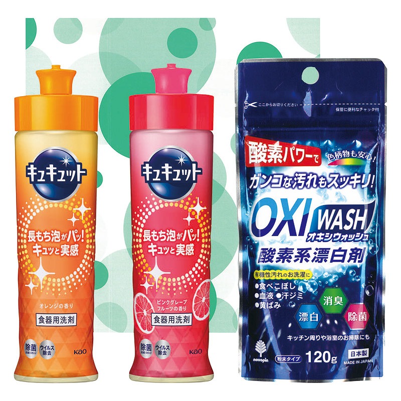セット内容/キュキュットオレンジ・キュキュットピンクグレープフルーツ(各220ml)・OXIウォッシュ酸素系漂白剤(120g)×各1