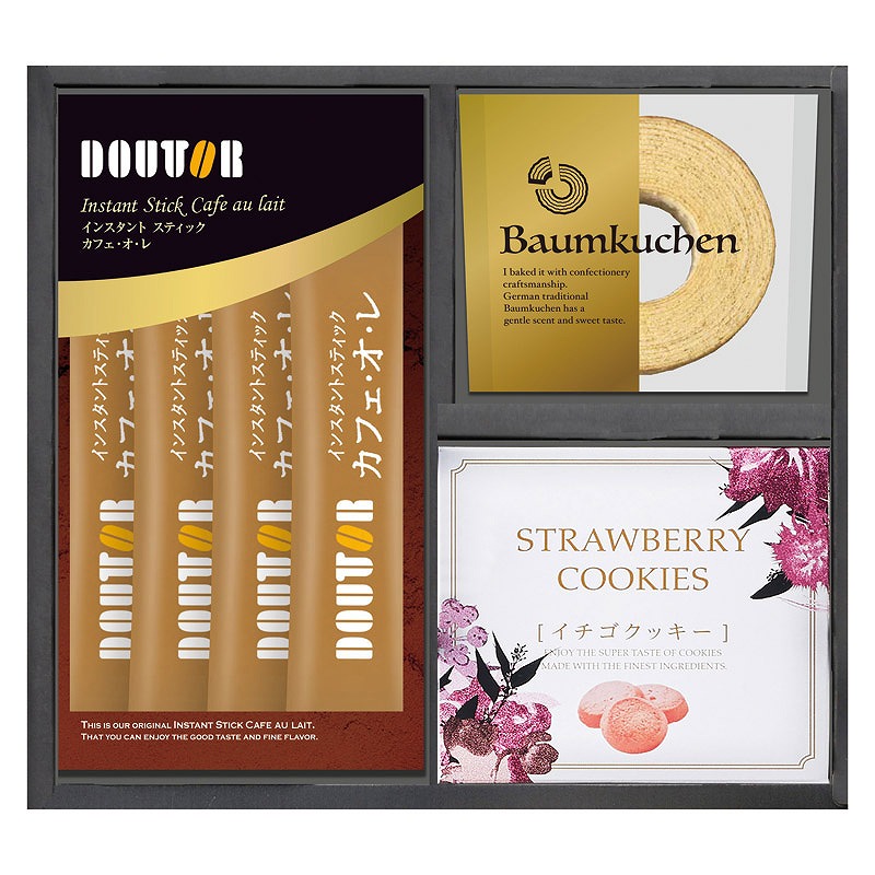 セット内容/ドトールカフェ・オ・レ(9.5g)×4、バウムクーヘン・イチゴクッキー(30g)×各1