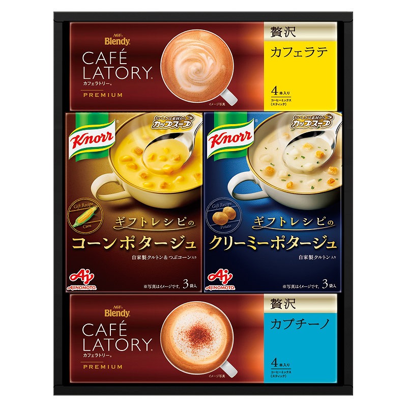 セット内容/クノールカップスープ (コーンポタージュ・クリーミーポタージュ)(各3袋)・ブレンディカフェラトリー(贅沢カフェラテ・贅沢カプチーノ)(各4P)×各1