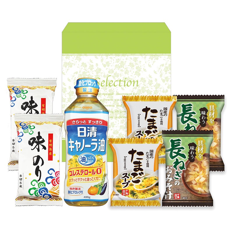 セット内容/味のり(8切5枚)・たまごスープ・具材をあじわう長ねぎのおみそ汁×各2、日清キャノーラ油(400g)×1