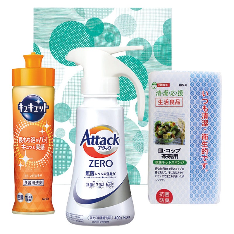 セット内容/花王アタックZEROワンハンド(400g)・花王キュキュットオレンジ(220ml)・食器用スポンジ(中国)×各1