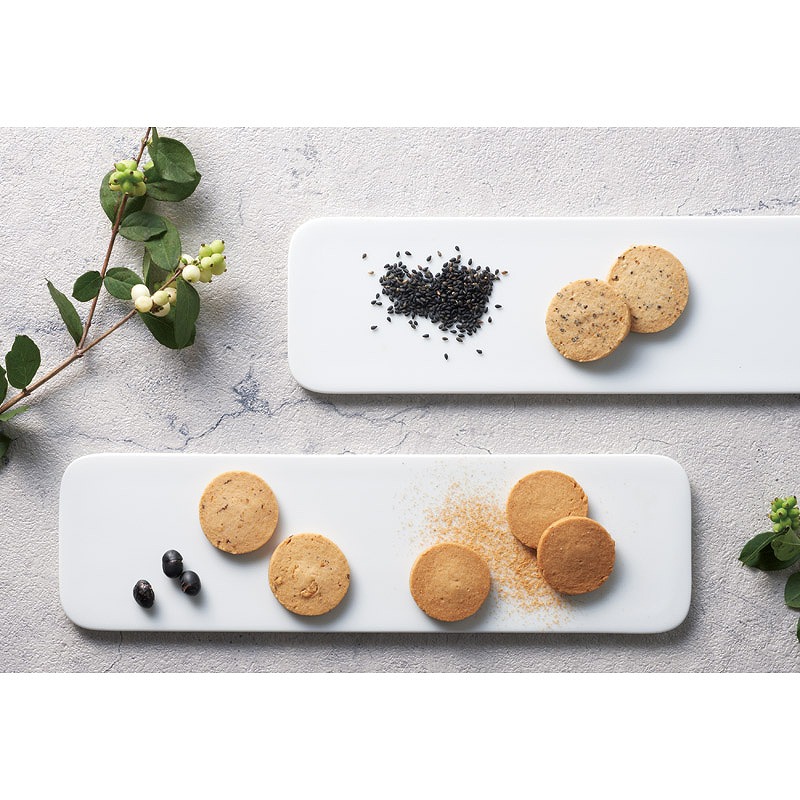 からだが喜ぶ国産素材だけを使いじっくりていねいに焼き上げました。ごま:安全無農薬、自然栽培で育てられた非常に貴重な香川産黒ごまを使用。黒豆:味わい深い丹波の黒豆を煎り砕いてクッキーに入れました。きなこ:甘味の強い北海道産大豆を香ばしく炒って挽いたきな粉を使用。