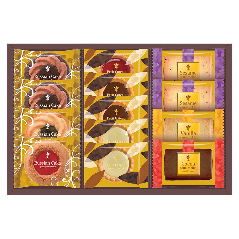 セット内容/サンドクッキー(セサミ)・ロシアケーキ(リッチビター)・プチガトー(ミルクチョコ・ホワイトチョコ)×各2、サンドクッキー(ココア・バニラ)・ロシアケーキ(マカロンストロベリー・フラワーキウイ)・プチガトー(ストロベリー)×各1