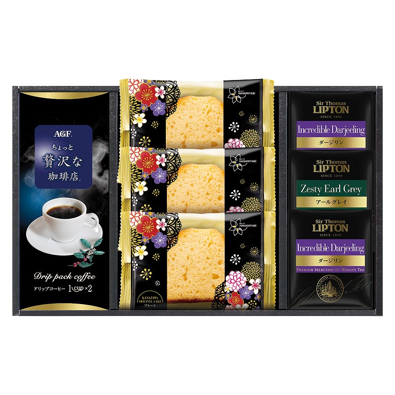 セット内容/金澤兼六製菓オリジナルケーキ(プレーン)×3、サー・トーマス・リプトン ダージリンティーバッグ(2.2g)×2、AGF ちょっと贅沢な珈琲店スペシャルブレンド(7g×2袋)・サー・トーマス・リプトン アールグレイティーバッグ(2.1g)×各1