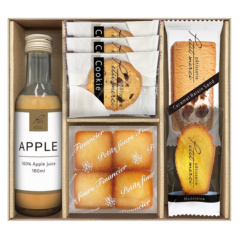 セット内容/ナッツとチョコのざっくりクッキー×3、プチフィナンシェ4個入(プレーン)・キャラメルレーズンサンド・マドレーヌ(プレーン)・フルーツドリンク(アップル)(180ml)×各1