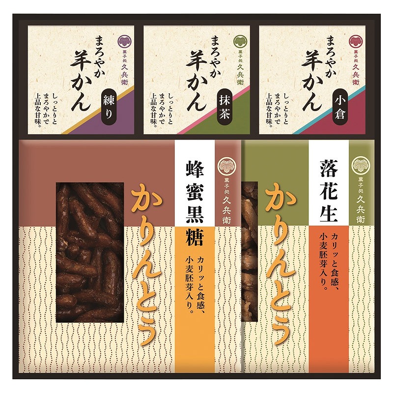 昔ながらの素朴な味のかりんとうと、夏でも冬でも楽しめるまろやか羊かんを詰め合わせました。