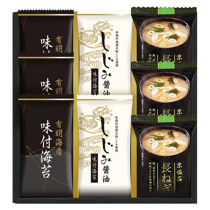 セット内容/マルコメ京懐石長ねぎのおみそ汁(15.7g)、有明海産味付海苔(8切8枚)×各3、じみ醤油味付海苔(8切8枚)×2