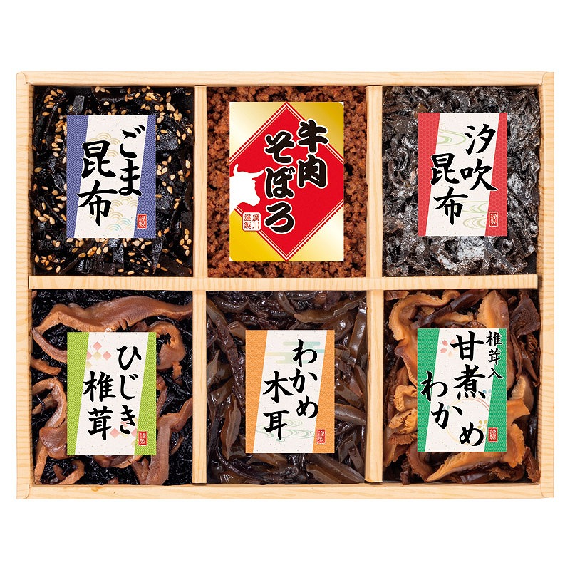 セット内容/汐吹昆布(20g)・ごま昆布・ひじき椎茸・椎茸入甘煮わかめ・国産牛肉そぼろ(各45g)・わかめ木耳(50g)×各1