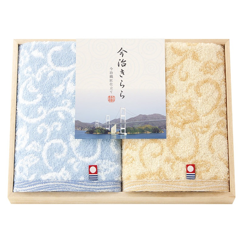 百二十年の歴史と受け継がれる職人技が光る情緒溢れる今治タオルを 高級感漂う木箱に丁寧に詰め合わせた、特別な贈り物