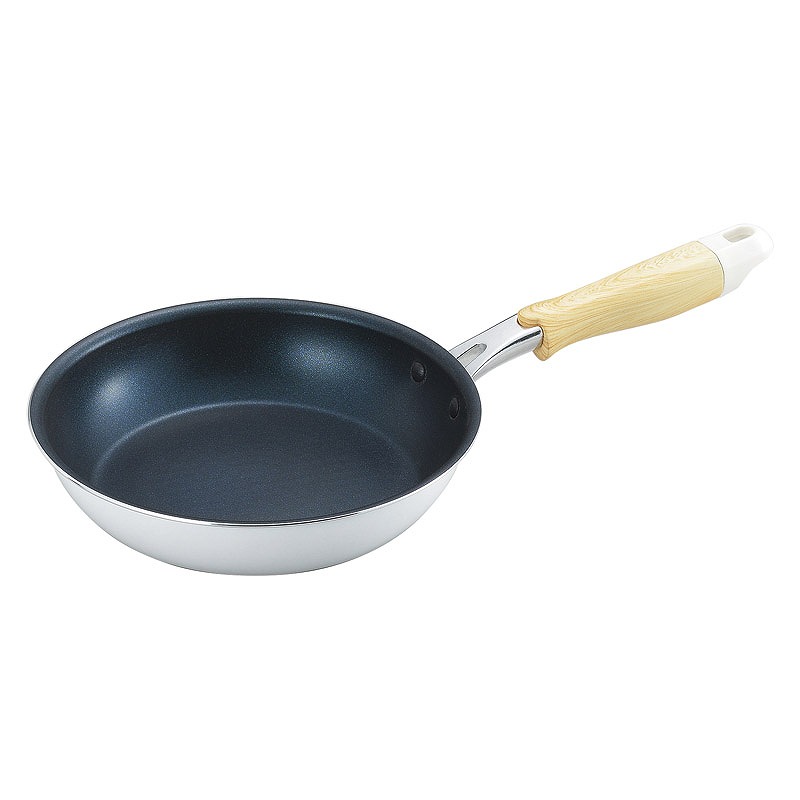 ホワイトカラーと木柄風の取っ手がキッチンに馴染みます。軽量で毎日の料理の負担になりにくい。焦げ付きにくいダイヤモンドコート加工。朝食やお弁当作りに丁度よい手頃なサイズ。