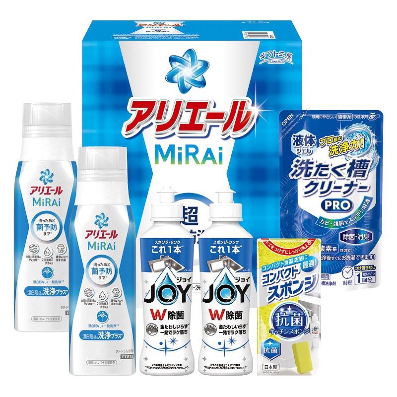 セット内容/P&Gアリエールミライ(330g)・P&G除菌ジョイ(170ml)×各2、コンパクトスポンジ・液体洗たく槽クリーナーPRO(200g)×各1