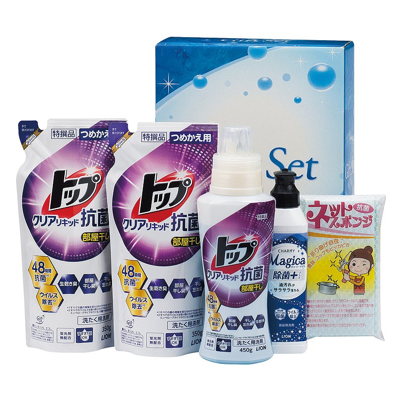 セット内容/ライオントップクリアリキッド抗菌(詰替用)(350g)×2、ライオントップクリアリキッド抗菌(450g)・ライオンCHARMY Magica除菌+(220ml)・ネットスポンジ(中国)×各1