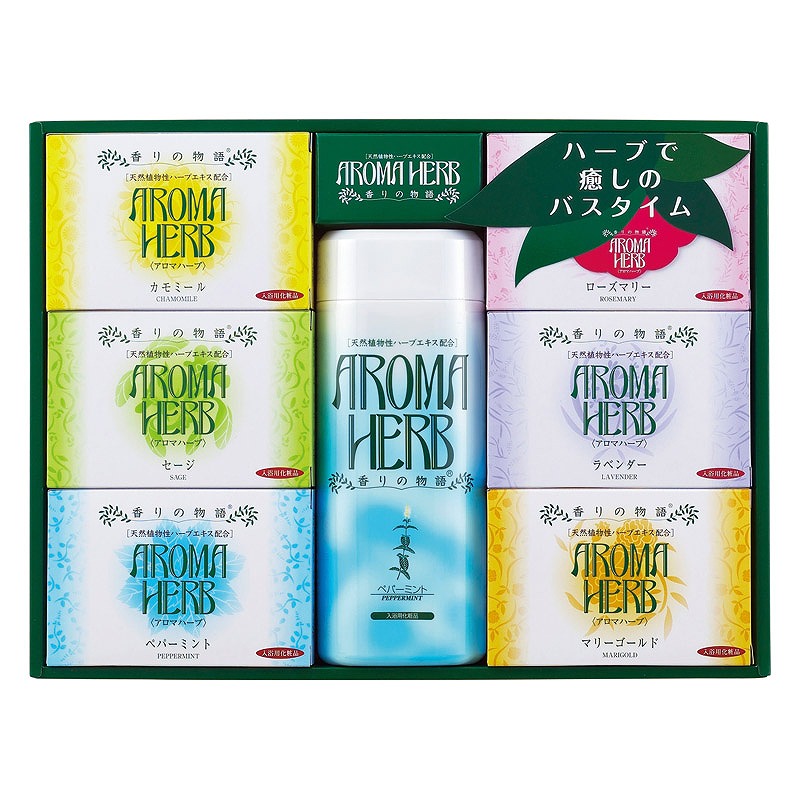 セット内容/ハーブエキス配合入浴料(カモミール・セージ・ローズマリー・ラベンダー・ペパーミント・マリーゴールド)(各30g×3包)・ハーブエキス配合入浴料(ペパーミント)(500g)×各1
