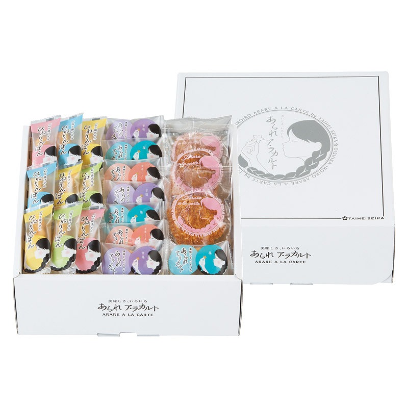 ふっくらしたおかきと、カリット揚がったひねり揚げ、濃い味がくせになるあげせんの3種類のあられ・アラカルトです、違った食感と味がお楽しみいただけます。
